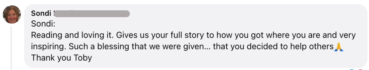 Toby made a pact with himself that when he recovered, he would do everything he could to make sure that no one else would have to go through their recovery alone like he did.